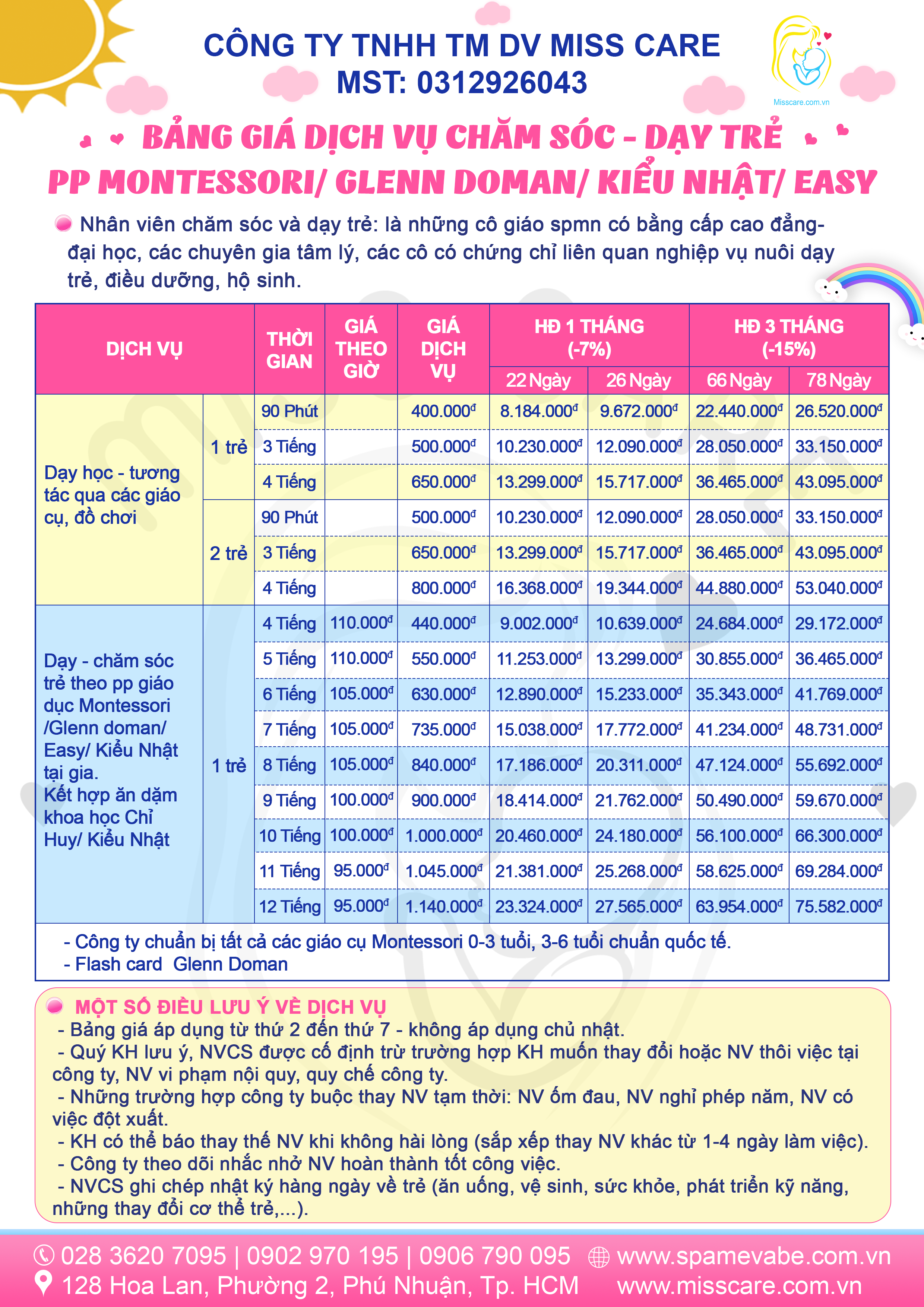 BẢNG GIÁ CÁC DỊCH VỤ TẠI MISS CARE 2023