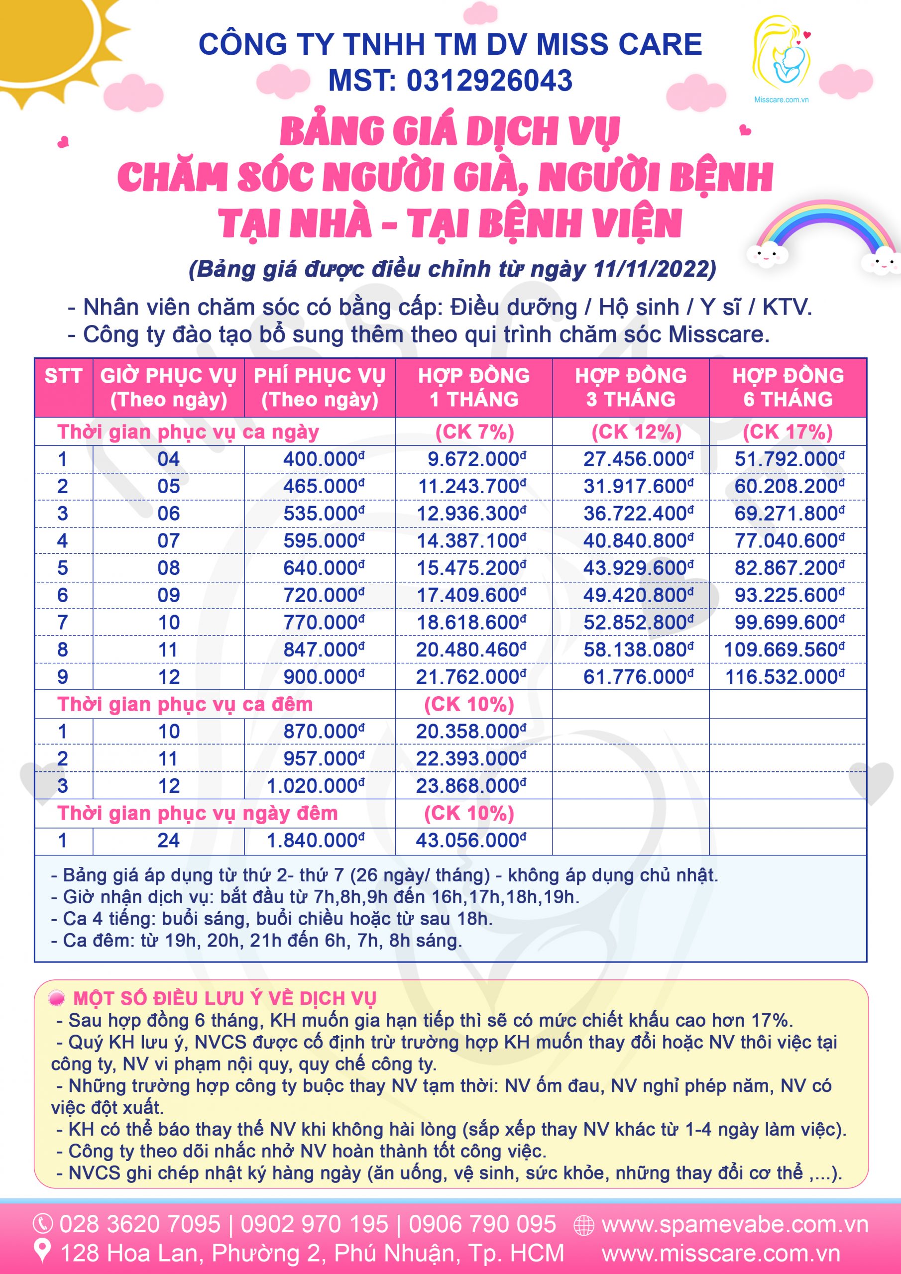 BẢNG GIÁ DỊCH VỤ CHĂM SÓC NGƯỜI GIÀ, NGƯỜI BỆNH