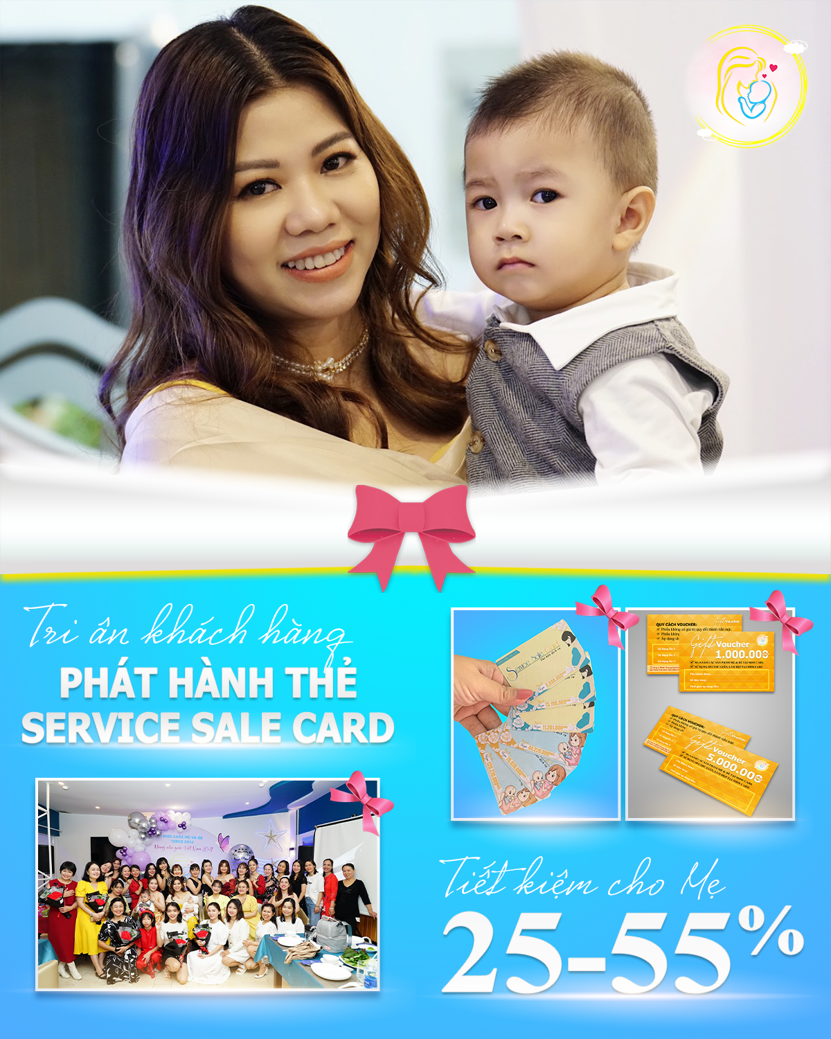 – Đặc biệt hơn Quý khách còn có cơ hội nhận thêm Voucher 1Tr, 2Tr và 5Tr ngay sau khi sở hữu thẻ này. Voucher được dùng cho các lần mua sản phẩm Mẹ & Bé hoặc sử dụng dịch vụ trực tiếp tại Miss Care Spa.